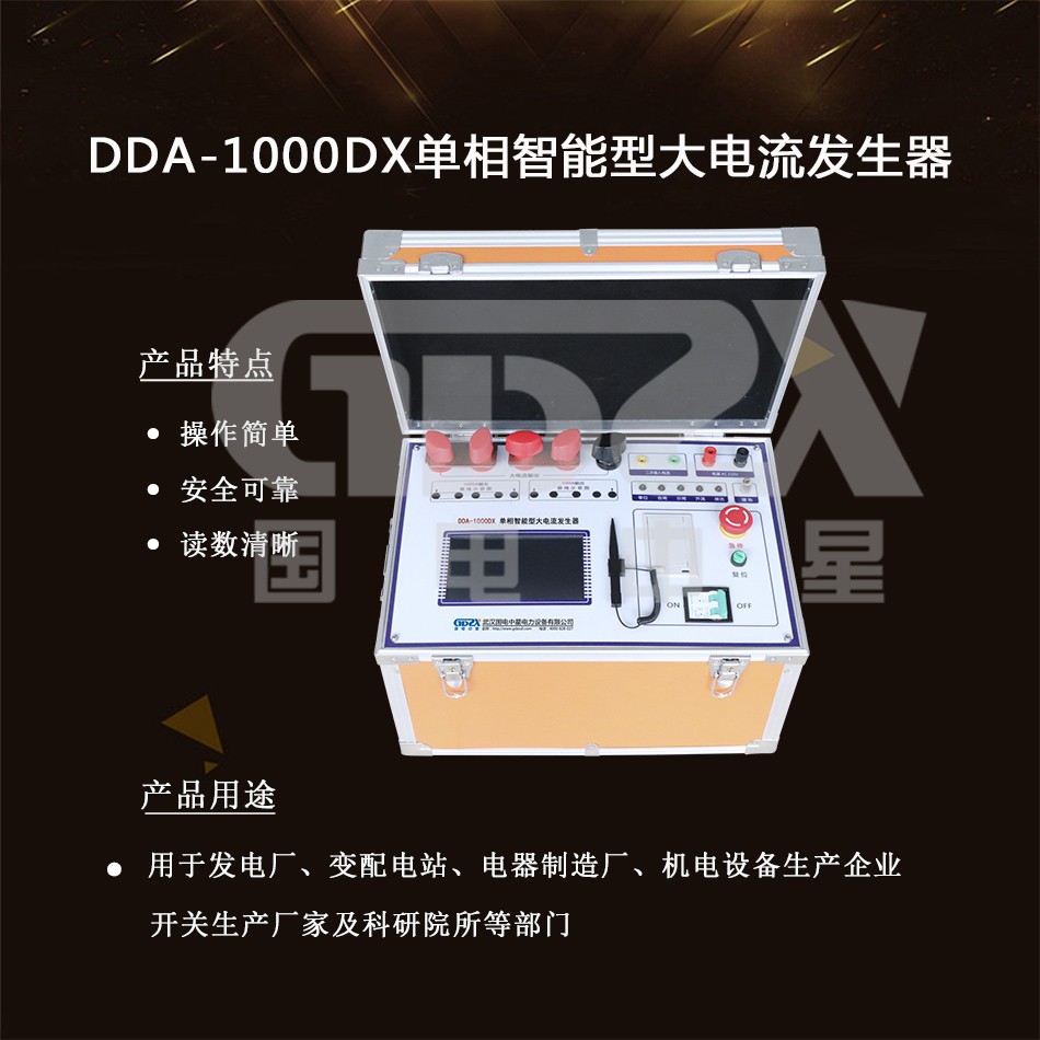 DDA-1000DX單相智能型大電流發生器是電力、電氣行業在試驗和調試中需要大電流輸出的必需設備,廣泛應用于發電廠、變配電站、電器制造廠、機電設備生產企業、開關生產廠家及科研院所等部門。儀器采用先進的微電子處理技術,全部使用過程可提前進行設置,全中文界面,操作簡單明了。全部測試項目設定后自動進行測試,無須人工干預,自動程度高,可靠性好。